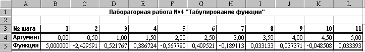 5. В ячейку B5 введите формулу расчета значения функции =5*exp(-B4)*cos(5*B4) для значения аргумента, хранящегося в ячейке B4. Методом автозаполнения скопируйте эту расчетную формулу в правые соседние ячейки до L5 включительно.