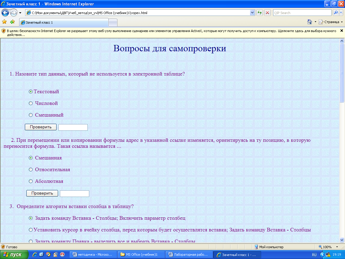 Содержание деятельности преподавателя | Проверка полноты и осознанности усвоения знаний. Студентам предлагается решить задачи из домашнего задания, используя абсолютную адресацию. Проанализировать полученный результат, сделать вывод, какой способ эффективнее, почему. | ||