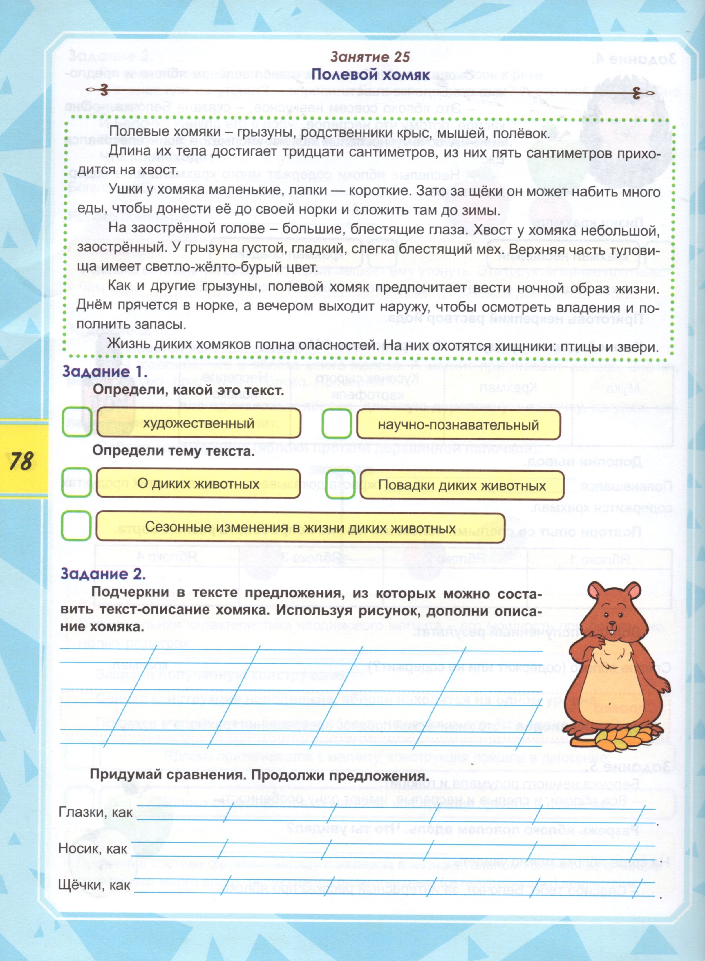 Задание 2. Подчеркните в тексте предложения, из которых можно составить текст - описание хомяка. Используя рисунок и фото презентации, дополните описание хомяка.