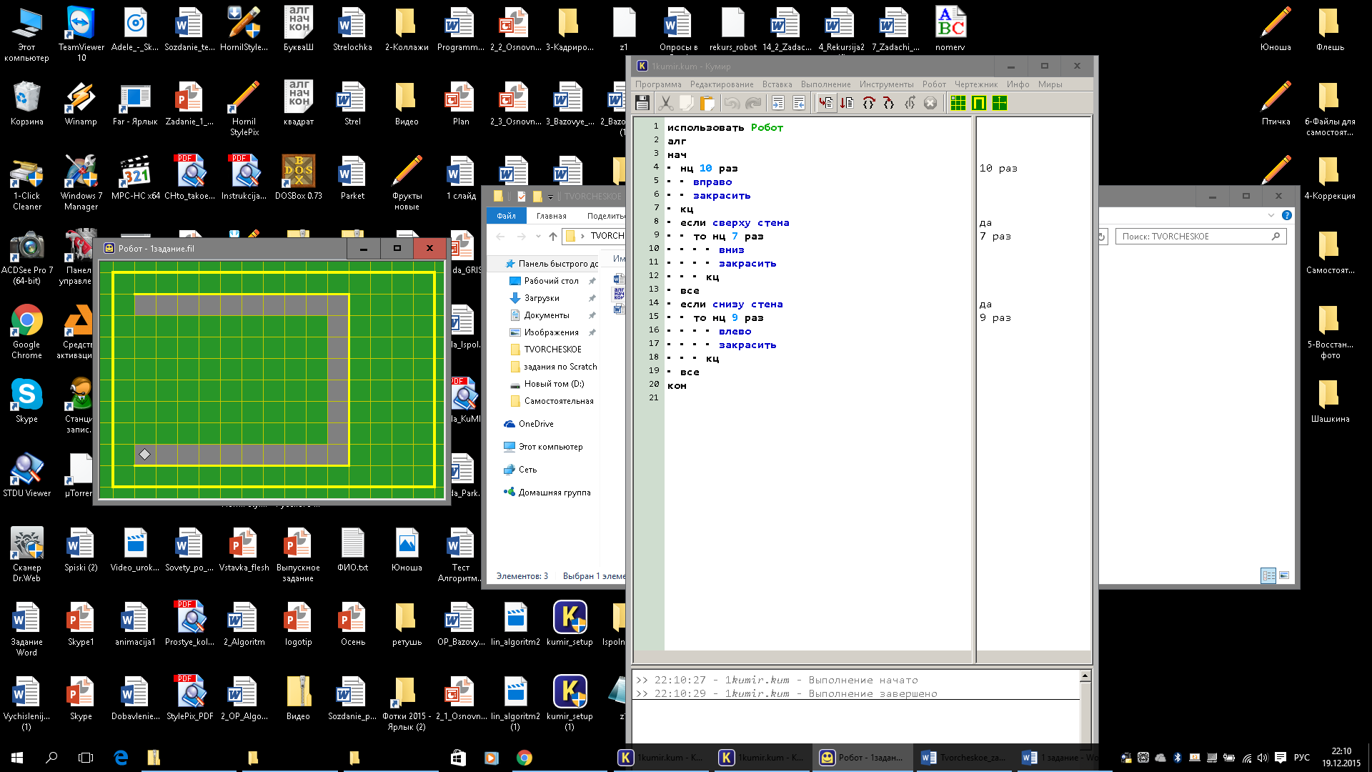 1шаг | Робот идёт вправо и закрашивает 10 клеток нц 10 раз вправо закрасить кц |