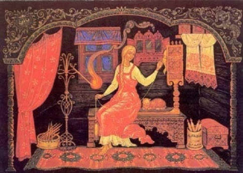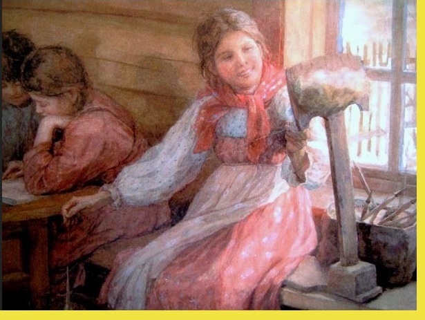 Мы с вами на прошлом занятии посмотрели видеоролик о том, как делали льняные ткани раньше, до применения машин, труд требовал большого терпения и усидчивости, надо было аккуратно расчесать и разгладить буквально каждую прядь волокон с помощью мыкалок, трепалок, чесалок. Отсюда и пошли известные выражения «мыкаться», «горе мыкать». В старину сидели девушки-красавицы в горнице, из кудели пряли пряжу, чтобы получилась скатерть или сарафан. Помните, как у А.С. Пушкина «три девицы под окном пряли поздно вечерком». Вот такую картинку с изображением девицы-пряхи мы с вами вклеили в тетрадь, и домашним заданием было найти на картинке все предметы, о которых мы с вами говорили. Откройте, пожалуйста, тетради, я пройду по рядам и посмотрю, как вы справились, а вы ещё раз посмотрите на экран (вывести на экран домашнее задание, если были затруднения – показать на экране)