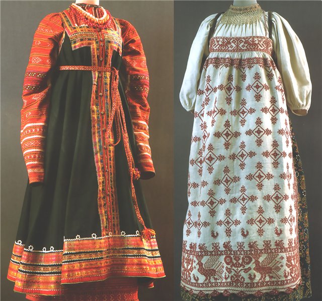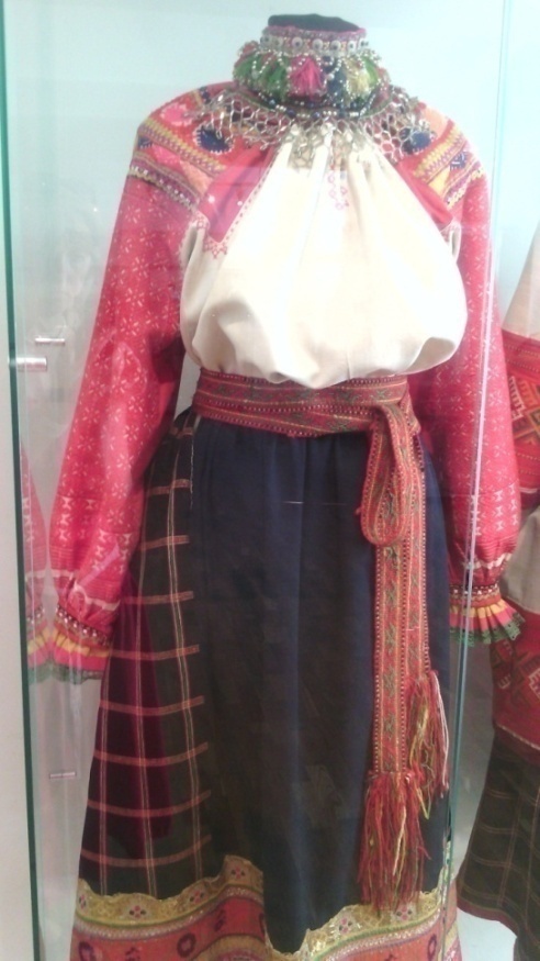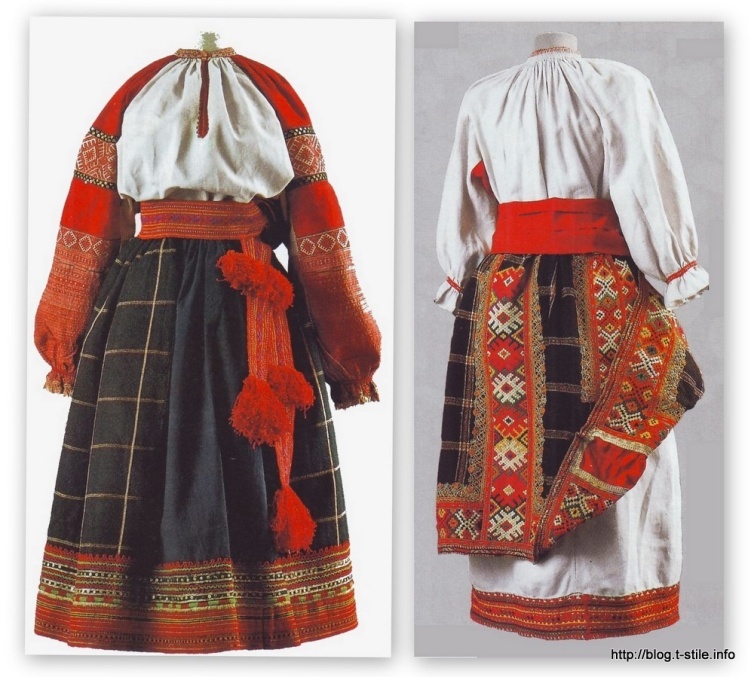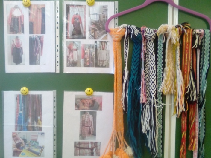 -Чем украшены костюмы? (Вышивка, пояса). Вывесить фотографии народных костюмов и старинные тканые пояса на доску.