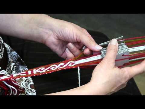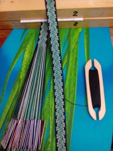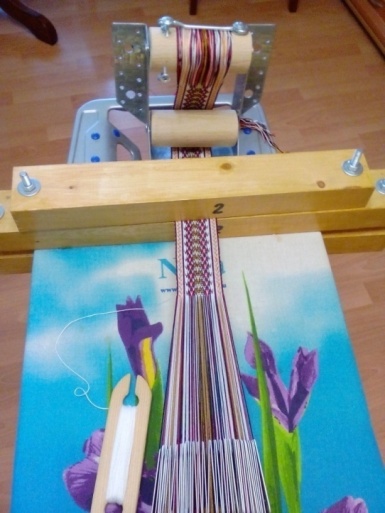 Прокладываем уточную нить в зев между карточками и ткачихой, подбиваем её рукой или линейкой и все дощечки поворачиваем в одном направлении, от себя на 90 градусов, образуя новый зев. В процессе ткачества нити основы за дощечками скручиваются между собой, и их время от времени приходится раскручивать.