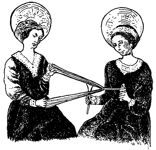 Техника «дерганья» – очень древний способ изготовления тесьмы. Еще в Х веке славяне плели такие узенькие прочные тесемки для обшивки понев (юбок), на петли для пуговиц, на «гашники» (завязки для штанов), на «оборы». Тесемки из толстых шерстяных нитей использовались для изготовления браслетов. Плели 2 человека, один плёл, другой поддёргивал-помогал. Давайте посмотрим несколько иллюстраций, в которых отражены техники создания поясов.