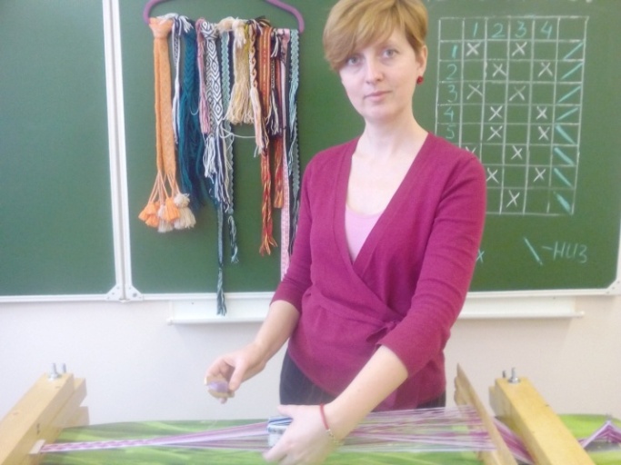 С-работают с учителем на ткацком станке (та же техника ткачества поясов на дощечках, только дощечки не привязываются к поясу ткачихи, а располагаются на ровной поверхности станка)