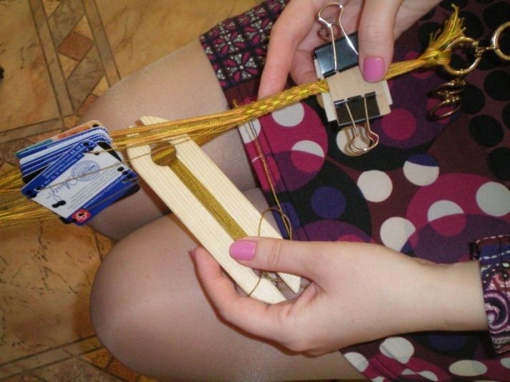 А-ткачество на дощечках. На доске расположена схема заправки ниток в картонные карточки/дощечки. Учащиеся самостоятельно осуществляют заправку, помогают друг другупривязать нити к поясу и к стулу. (приложение 5)