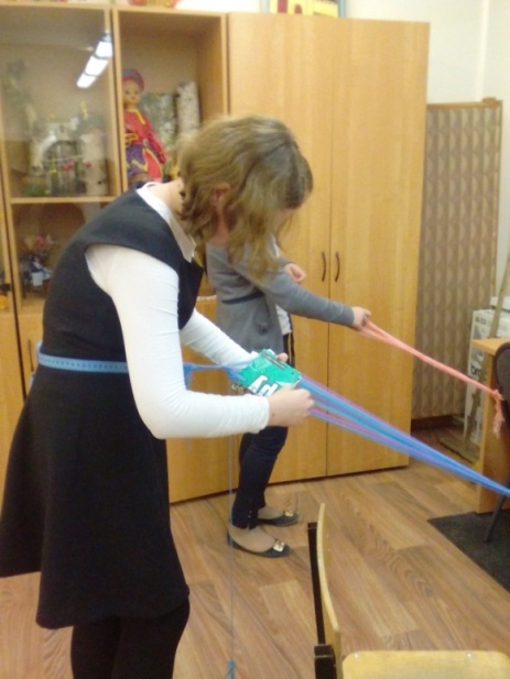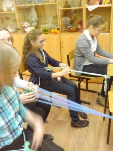 Игра «Мастерица». Обучающимся предлагается сплести по небольшому поясочку самостоятельно и поработать на ткацком станке.