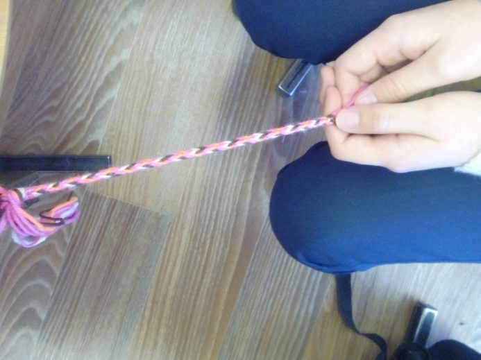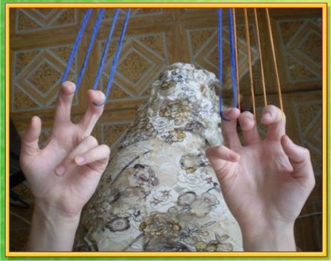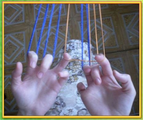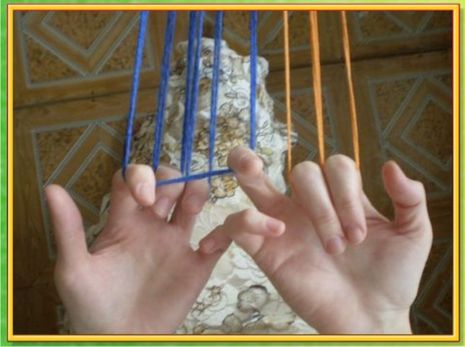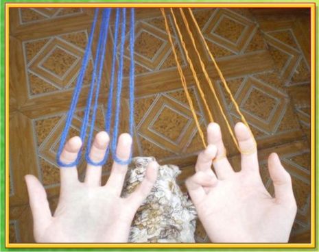 В-выполнение «дерганцов». Нарезанные шерстяные ниточки складываем пополам, привязываем к стулу всю связку, а получившиеся петельки надеваем на пальчики, схема плетения перед вами на партах (приложение 7,8)