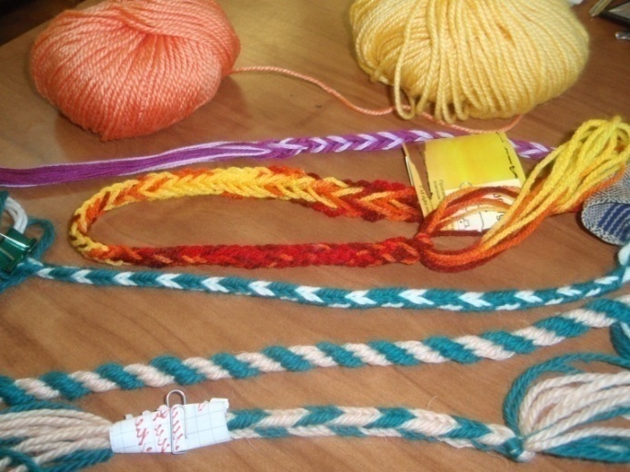 Таким «дерганьем» можно плести и плоские тонкие пояса, тесёмки, завязки. Этот способ удобен для изготовления небольших детских поясков и всевозможных завязок для хозяйства. -Какое применение им можно найти сейчас?– Это может быть шнурок для телефона, подхват для штор, завязка для косы, тесёмки для шапки, закладка в книгу.