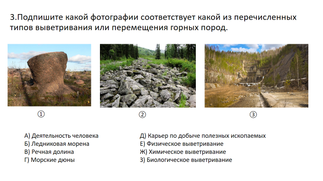 1.Вставьте пропущенные слова в текст, используя предложенные термины, не нарушая его смысл. Выветриванием называют процесс … и … горных пород на поверхности суши под воздействием атмосферного … , солнечных … , грунтовых и поверхностных … и жизнедеятельности … . а) разрушения; б) изменения; в) переноса; г) отложения;д) воздуха;е) лучей; ж) вод; з) организмов; и) ветра;к) потоков; л) ледников; м) рек. (1-а, 2-б, 3-д, 4-е, 5-ж, 6-з) 2. Стрелками укажите соответствие между видами выветривания и их результатами. ![]()
