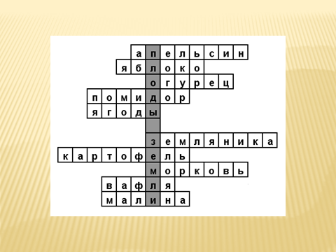 - А мы начинаем работу со словарными словами. Ваша задача – разгадать кроссворд (картинки: апельсин, яблоко, огурец, помидор, ягоды, земляника, картофель, морковь, вафля, малина)