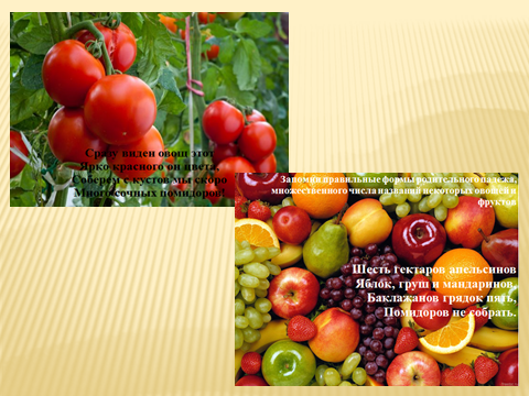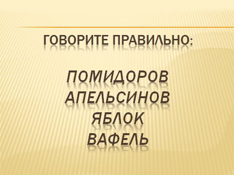 - Употребите слова: помидор, апельсин, яблоко, вафля в форме мн. ч. род. п.