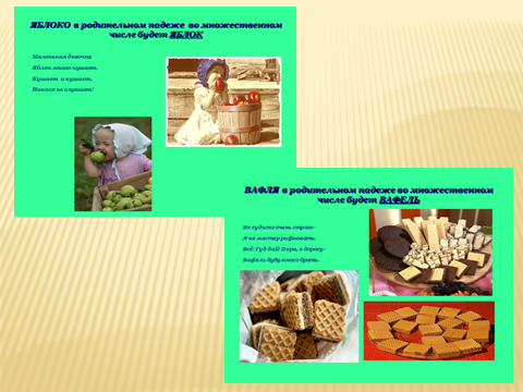 К выполнению задания я решил подойти творчески. Сначала из словаря узнал правильную форму слов. А потом сочинил стихи. Думаю, они помогут лучше запомнить слова: «Маленькая девочка яблок много кушает. Кушает и кушает, никого не слушает». «Не судите очень строго – я не мастер рифмовать. Всё! Гуд бай! Пора в дорогу, вафель буду много брать».