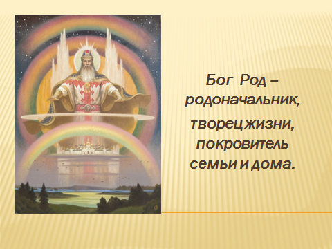 Род - главный бог славяно-русской мифологии, родоначальник жизни; дух предков, покровитель семьи и дома. Он породил, сотворил всё, что мы видим вокруг, весь наш мир.