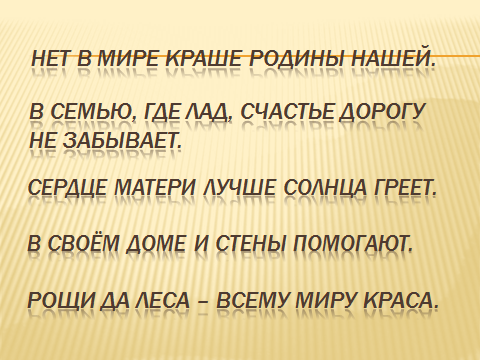 - Итак, сейчас прозвучали главные слова. Это … Эти слова были самыми важными в жизни человека всегда. Об этом говорит народная мудрость. О каком жанре я говорю?