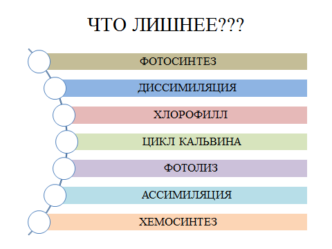 - А сейчас обратимся к изображениям. Посмотрите на представленные здесь биологические термины: «фотосинтез», «диссимиляция», «хлорофилл», «цикл Кальвина», «фотолиз», «ассимиляция», «хемосинтез». Определите, какой из них является лишним? Почему?