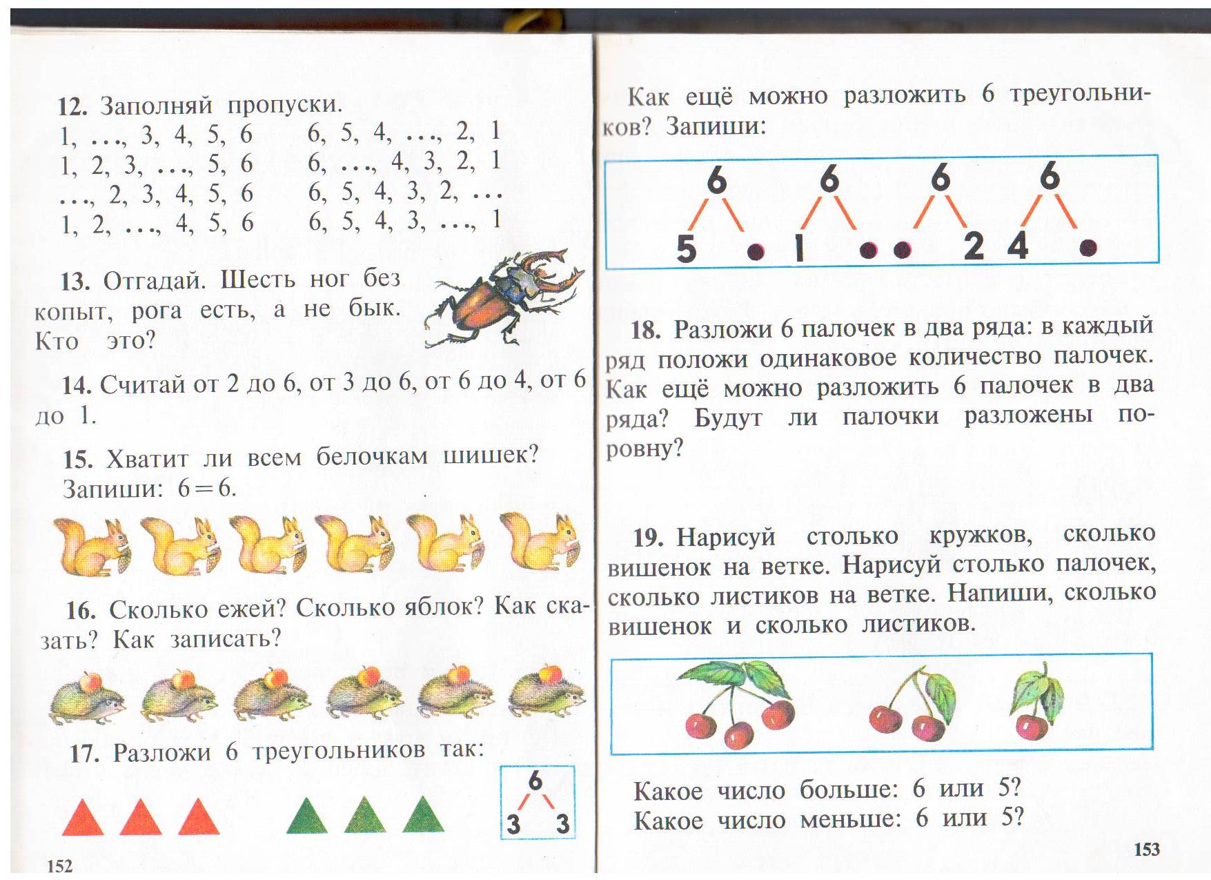 5. Закрепление изученного материала. | Познавательные БУД: - умение анализировать, сравнивать, ориентироваться в тетради. Коммуникативные БУД: - умение слушать и слышать. | (НАПОМИНАЮ ОБ ОСАНКЕ) 1. Работа с учебником. - Открыли учебники на стр… Считай от 2 до 6, от 3 до 6, от 6 до 4, от 6 до 1. -Хватит ли всем белочкам шишек? Запиши: 6=6