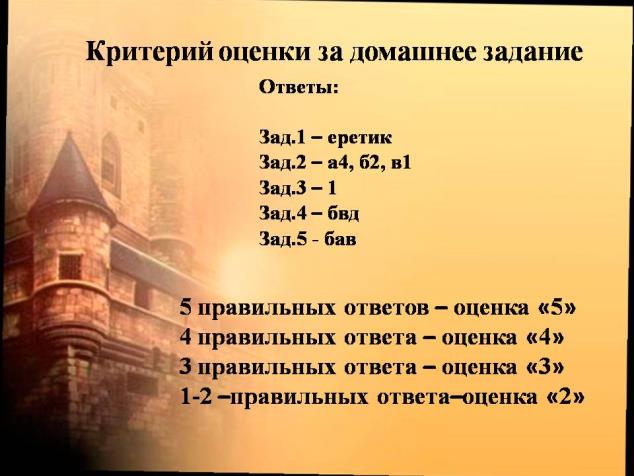 Проверка домашнего задания (4 мин) | Организует проверку домашнего задания. - На ваших партах находится лист с вопросами. Вам необходимо решить их. (Приложение 2) Организует взаимопроверку учащихся. На экране (сл.2) критерии оценки и правильные ответы. 5 правильных ответов – оценка «5» 4 правильных ответа – оценка «4» 3 правильных ответа – оценка «3» 1-2 –правильных ответа–оценка «2» | Выполняют тестовые задания в предложенных листах. Поверяют работу соседа по парте и ставят оценку по критериям прописанным на доске. |