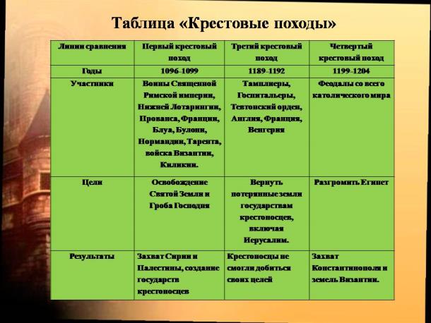 Таблица «Крестовые походы»