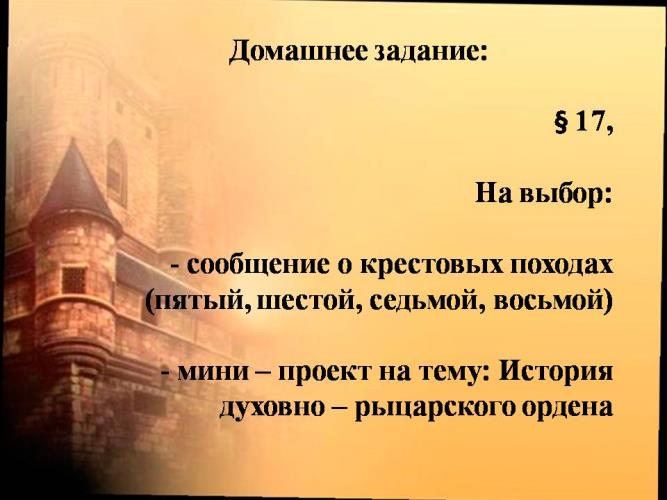 Домашнее задание (2 мин) | § 17, (сл.8) На выбор: - сообщение о крестовых походах (пятый, шестой, седьмой, восьмой) - мини – проект на тему: История духовно – рыцарского ордена | Записывают в дневник задание |