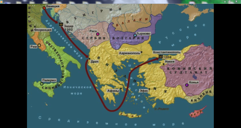 На месте Византии основали Латинскую империю, которая просуществовала полвека. Оно представляло из себя эфемерное образование, зависевшее от венецианского флота и паразитировавшее на византийских богатствах. 1261 год — император Никеи Михаил III Палеолог при помощи генуэзцев смог изгнать крестоносцев из Константинополя.