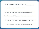 III этап. Включение в систему знаний и повторение. | Das ist ein Kalender und ihr sammelt die Information zu diesen Monaten. Einer hilft dem anderen. Работа с календарем: дай характеристику каждому месяцу. Инструктаж по работе с календарём (декабрь, январь, февраль) Помоги соседу заполнить календарь погоды Организовать работу групп. Was machen die Kinder gern im Winter? Wen sehen wir auf diesem Bild? Wer läuft Schi? Wer rodelt, ein Junge oder ein Mädchen? Laufen die Kinder Schi? Rodeln die Kinder? Wer baut einen Schneemann? Laufen die Kinder Schi? | Schreibe die Monatsnamen in der richtigen Reihenfolge. Der Januar Der Februar Der Marz Der April Der Mai Der Juni Der Juli Der August Der September Der Oktober Der November Der Dezember Ein Junge läuft Schi. Ein Mädchen rodelt. Ja, die Kinder laufen Schi. Ja, die Kinder rodeln. Ein Kind baut einen Schneemann. Die Kinder laufen Schi. | Рассмотреть разные месяцы и расположить их по порядку, дать характеристику каждому месяцу. Какие ответы подходят к какому вопросу? Сравните перевод и соотнесите предложения по смыслу. | Страница 4-5