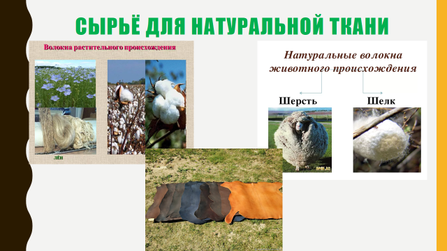 (Слайд 4) (У) А из чего же делают нити для ткани?(из растений: хлопок, лён; шерсть и кожа животных, из шёлка).