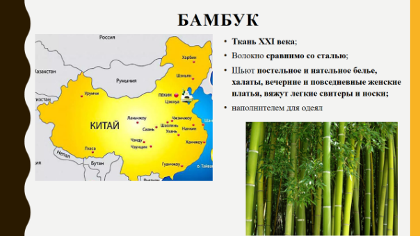 бамбука с хлопком шьют постельное и нательное белье, халаты, вечерние и повседневные женские платья, вяжут легкие свитеры и носки.
