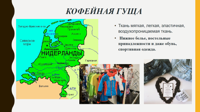 Слайд 11. Кофейная гуща. Ткань мягкая, легкая, эластичная, воздухопроницаемая.
