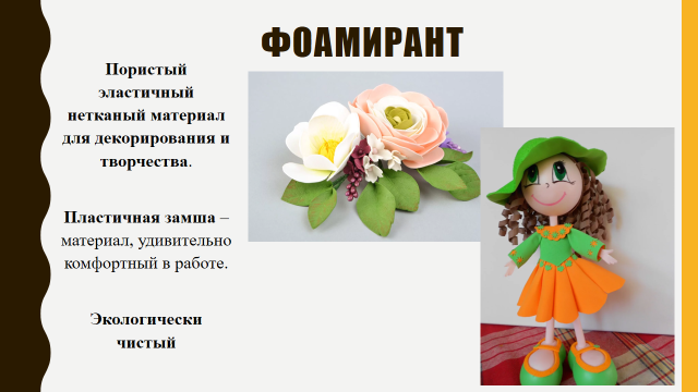 Слайд 16..Фоамиран – пористый эластичный нетканый материал для декорирования и творчества, изобретенный в результате сложных химических экспериментов крупной иранской фирмой Foamiran Co.