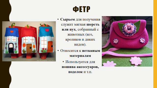 Слайд 17.Фетр – это однородная, плотная масса валяных волокон, механического происхождения. Структура не имеет переплетающихся нитей, и материал относится к нетканым видам.