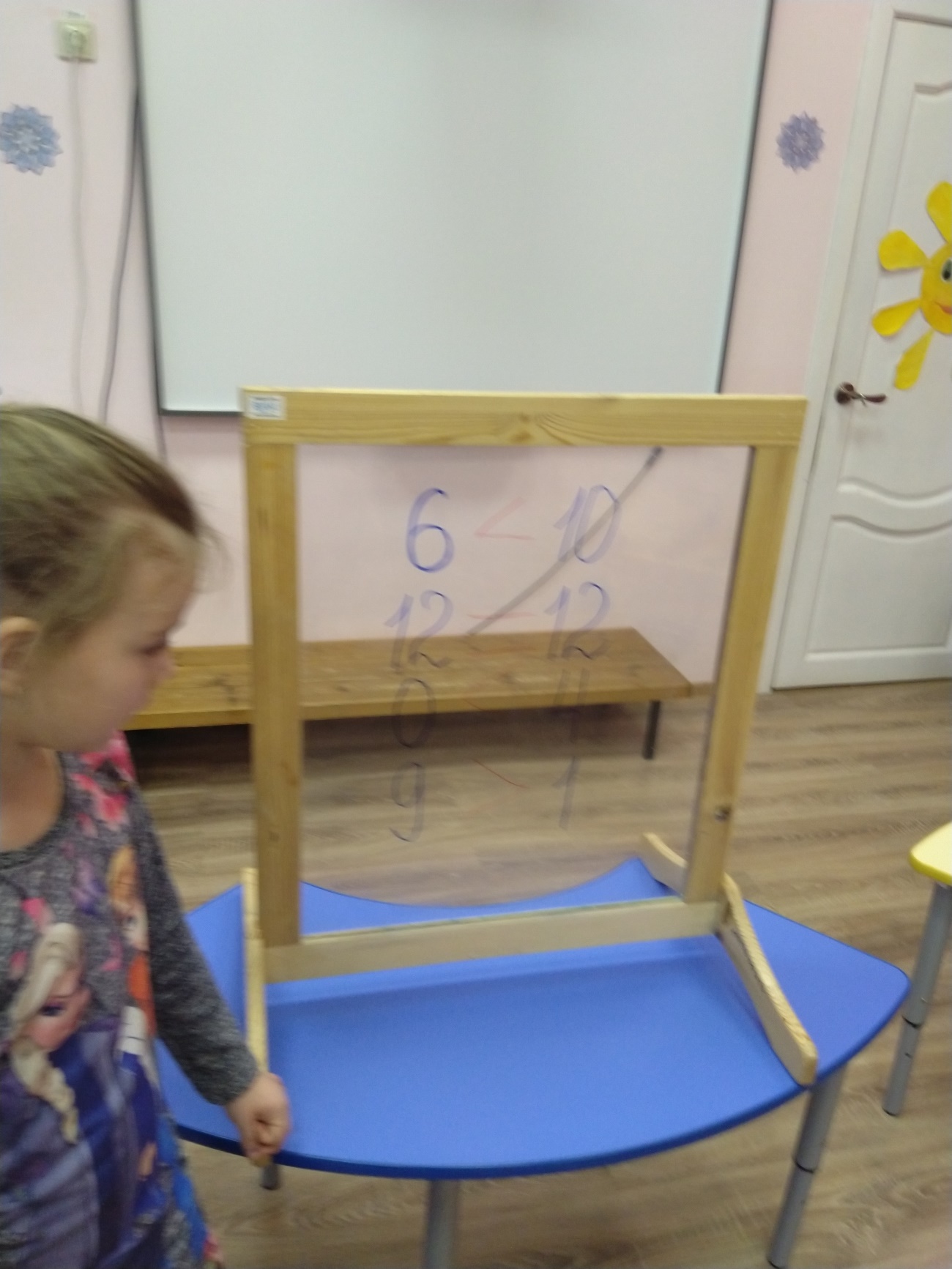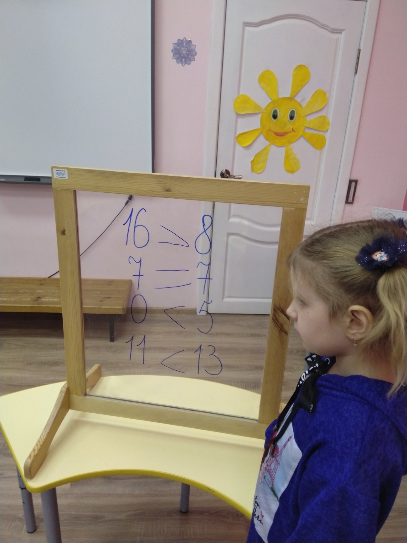 В.: на прозрачных мольбертах записаны числа, между ними нужно расставить правильные знаки («>»; «<»; «=»). Знаки заняли свои места и тоже благодарят вас за помощь.
