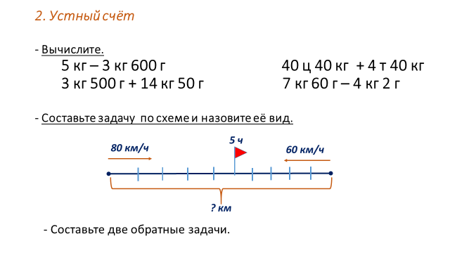 I. Актуализация опорных знаний | 1. Проверка домашнего задания с.36, № 5. Слайд 1. - Назовите длины отрезков, которые вы начертили. (10 см, 5 см, 8см, 3 см) 2.Устный счёт. Слайд 2. - Вычислите. 5 кг – 3 кг 600 г 40 ц 40 кг + 4 т 40 кг 3 кг 500 г + 14 кг 50 г 7 кг 60 г – 4 кг 2 г 3. Работа над задачей. - Рассмотрите схему к задаче и назовите её вид. Составьте задачу по схеме.