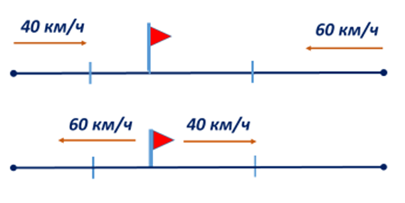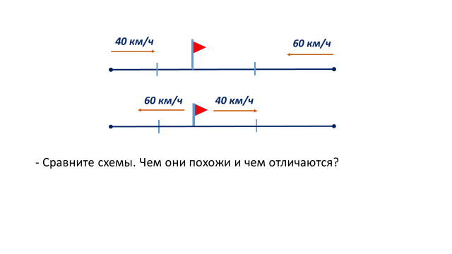 - Назовите чем похожи схемы? (Два автомобиля, скорость 40 км/ч и 60 км/ч) - Чем они отличаются? (На первой схеме едут навстречу друг другу, а на второй в противоположных направлениях) -Попробуйте назвать тему и цель урока. | Работают коллективно. Работают с информацией, представленной на слайде. Работают со схемами, сравнивают их. Выделяют и осознают то, что уже усвоено и что ещё подлежит усвоению. Отвечают на вопросы. Учатся обосновывать свои ответы. Называют тему и цели урока. | Находить общее и различия, делать вывод. Осознанно и правильно делать высказывания в устной речи. | ||||||||||||
