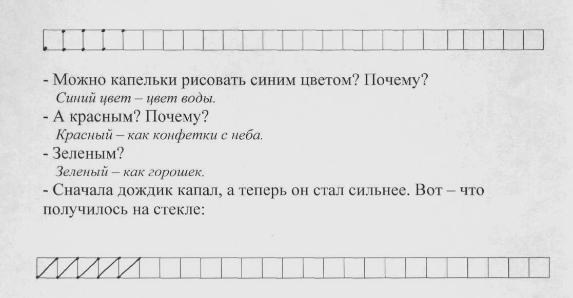 - Можно капельки рисовать синим цветом? Почему? - А красным? Почему? - Зеленым? - Сначала дождик капал, а теперь он стал сильнее. Вот – что получилось на стекле: