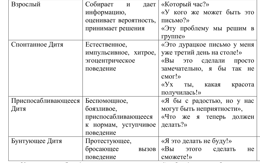 Дитя – поведение, характеризующееся ориентацией на собственные желания, советы взрослых, родителей; проявлениями творчества, оригинальности, чувств (обиды, страха, вины, восхищения и т. п.), подчинения, беспомощности. Дитя задает вопросы: «Почему я?», «За что меня наказали?», извиняется в ответ на замечания и т. п. Фраза- Я хочу! Спонтанность.