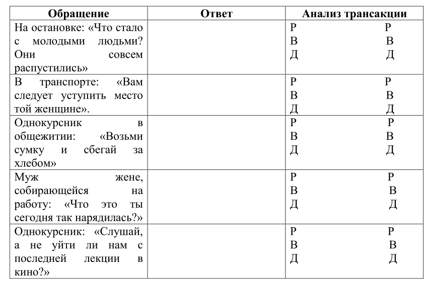 В левом столбце таблицы приведены обращения людей, занимающих в разговоре определенную позицию («Родитель», «Взрослый», «Дитя»). Ваша задача сформулировать собственный ответ на каждое обращение в среднем столбце таблицы. Затем определить позиции участников диалога и схематически отразить трансакции-высказывания в правом столбце таблицы.