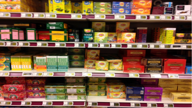 - Затем они попадают на фабрику, где их сушат, измельчают и фасуют. -Как вы думаете, куда затем попадает чай? Дети отвечают. Слайд 5 Супермаркет, полки с чаем