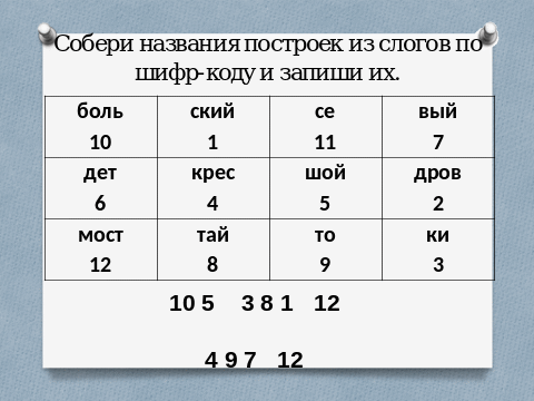 – Идем к завершению нашего пути. Каждой цифре соответствует свой слог, вам нужно найти кодовые слова и записать их. - Читаем, что получилось. – Отлично справились. Молодцы. Большой китайский мост проектировал архитектор Ч. Камерон, а Крестовый мост архитекторы отец и сын Нееловы. | Дети в таблице ищут соответсвующей цифре слог и составляют слова. .- Большой китайский мост, Крестовый мост. Дети получают наклейки и крепят их на план парка. | Задание «Код слова» Слайд 14 с заданием.