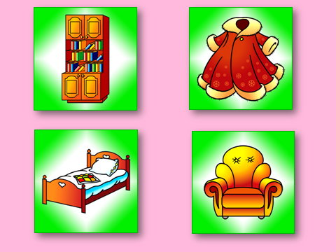 Оборудование и материалы:по 3 набора карточек (мебель, бытовая техника, транспорт; птицы, насекомые, животные). И дополнительно по одной карточке из других групп.