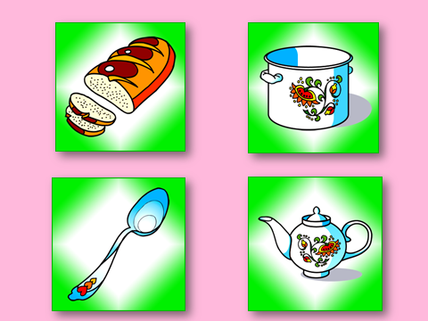 предметы, в названии которых встречается звук «К»: карандаш, ручка, краски, резинка, клей, книга, обложка; другие предметы: машинка, ножницы, кубик, кукла, мяч.