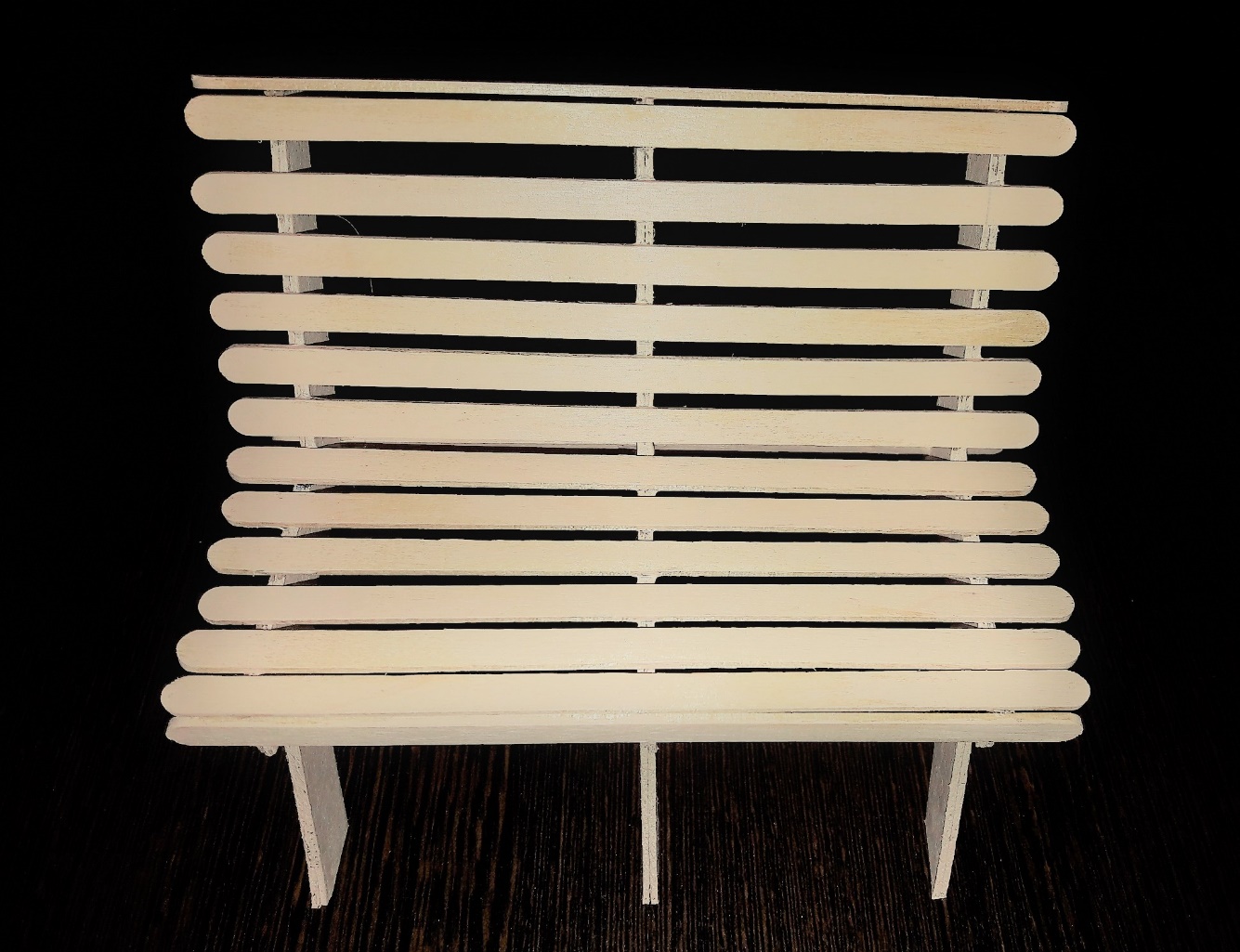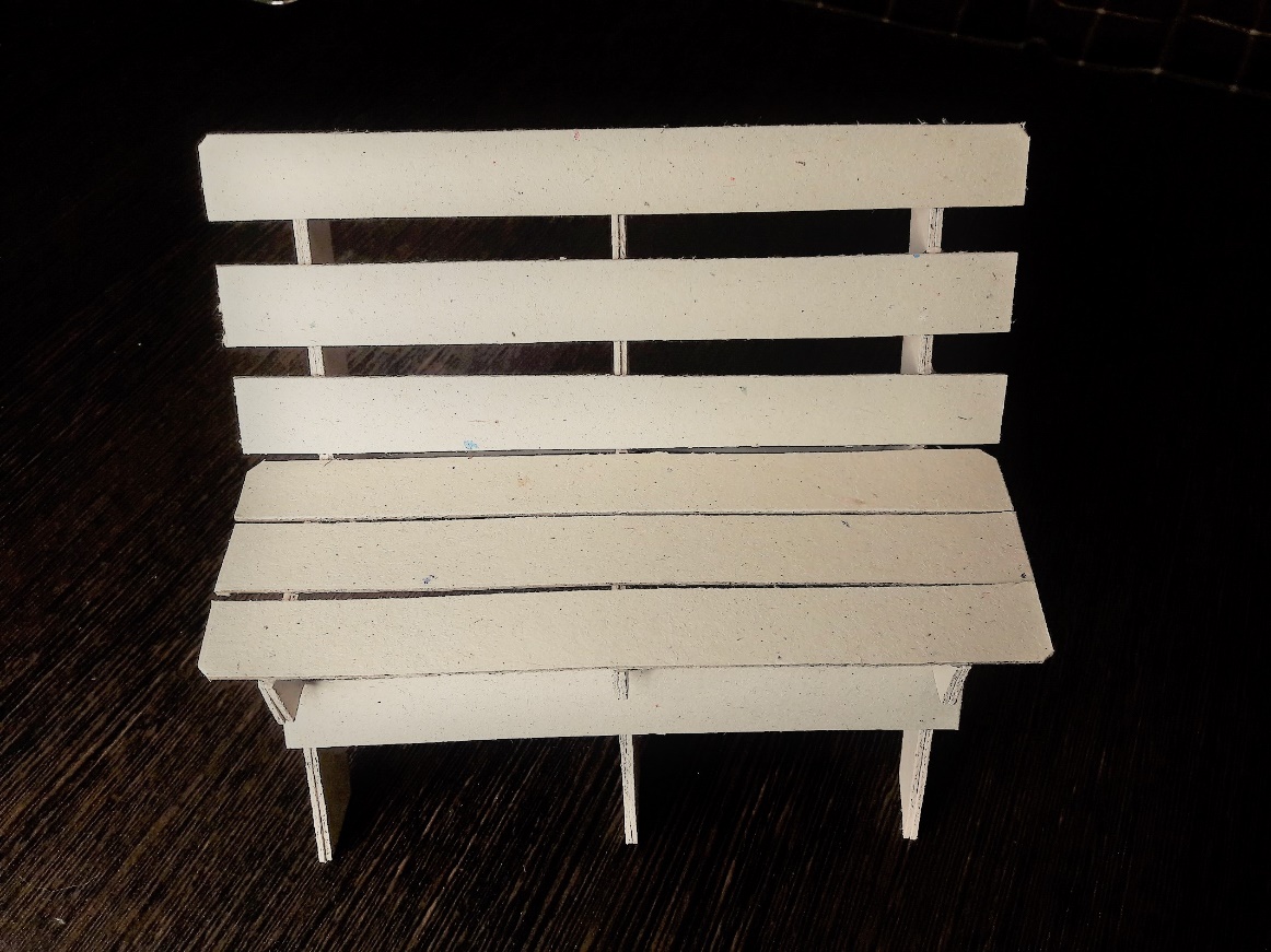 Приклеиваем картонные полоски на сидение и спинку скамейки. Каждый раз полоску нужно немного подержать, чтобы клей "схватился". После просыхания или затвердевания клея красим скамейку. Не красьте сразу после склеивания!