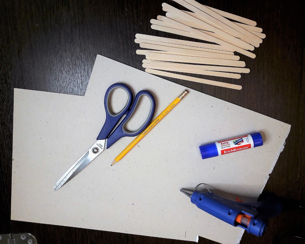 Подготовить все необходимые материалы и инструменты. У картона убрать скрепки, скотч, наклейки, если таковые есть. Бывшие у употреблении палочки промыть и просушить.