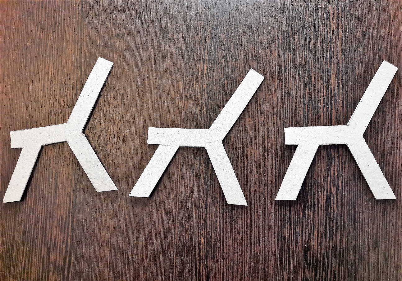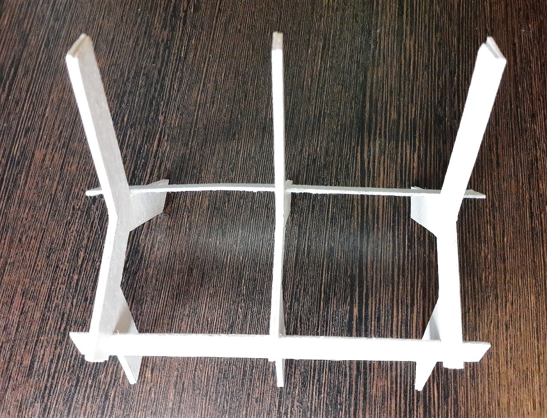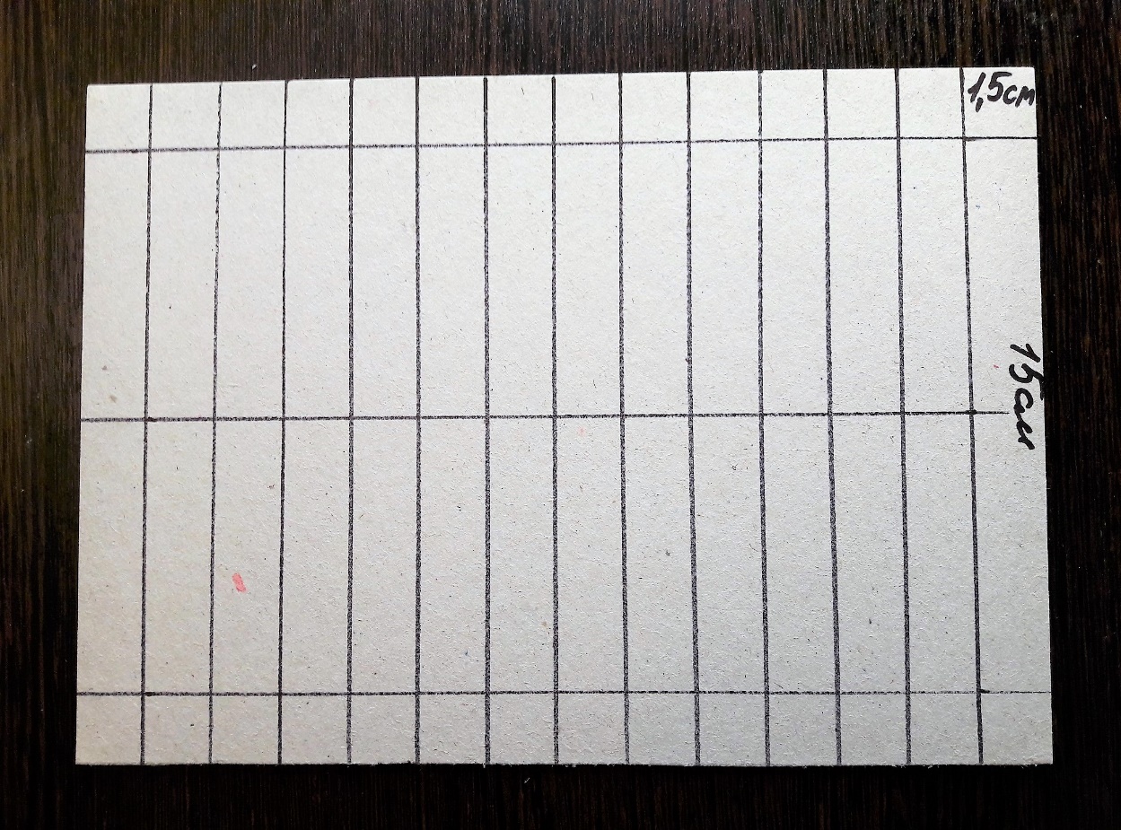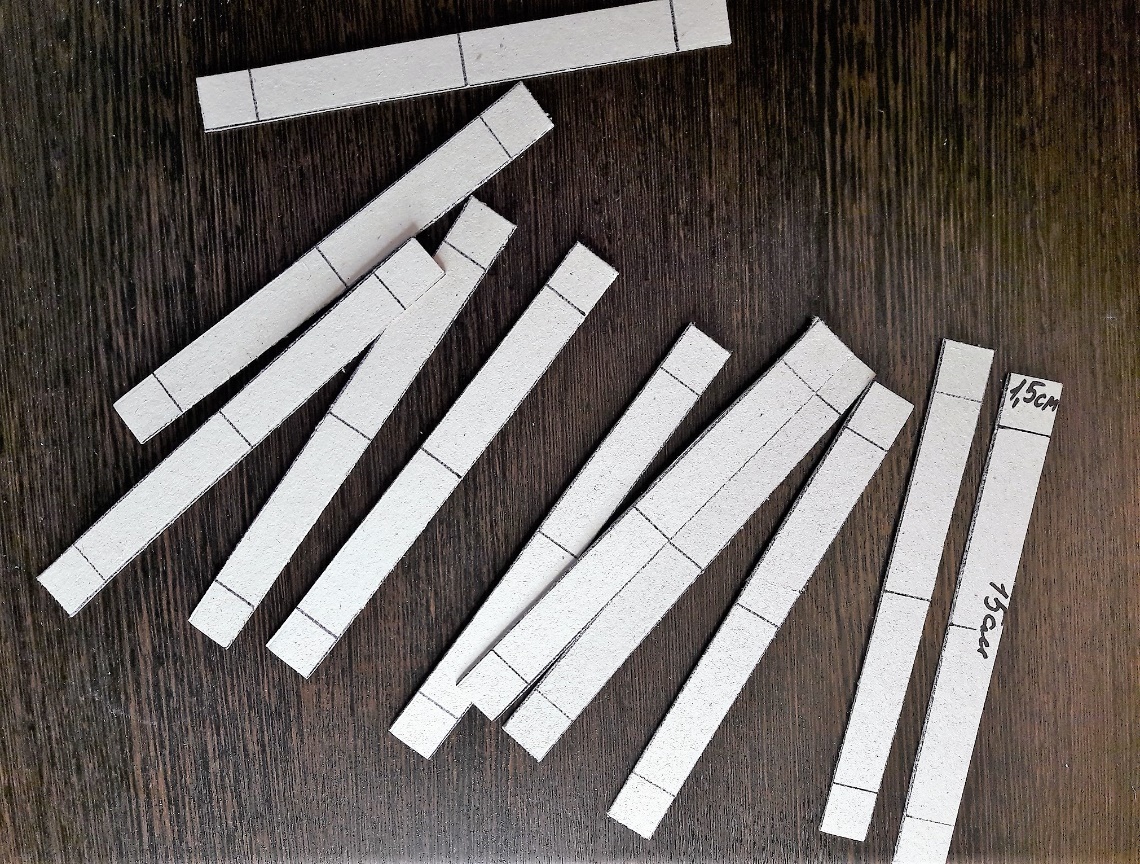 Если у вас нет палочек, разметьте на картоне полоски нужной вам длины и ширины. Сразу прочертите контрольные линии по краям и по середине! Это будут линии приклеивания ножек скамейки.