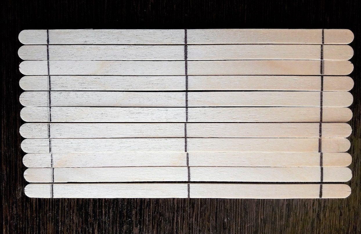Если у вас есть деревянные палочки, просто сложите их вместе (10-12 штук) и прочертите контрольные линии приклеивания: по середине и по краям, отступив от края 1,5-2 см.