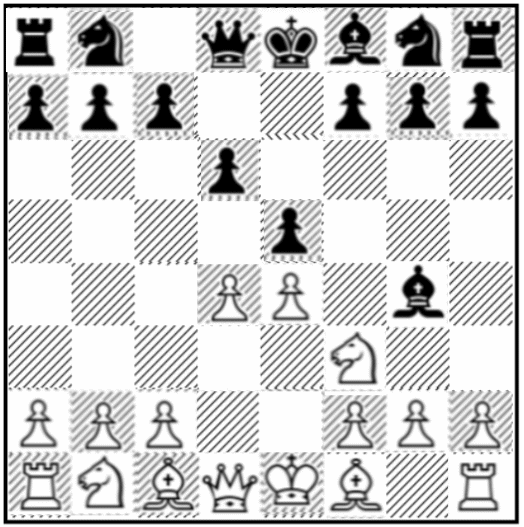 Рис. 1 Ходом 3. . . Cc8 – g4 чёрные связали белого коня на f3.Ход выглядит сильным, но является слабым, так как после ходов 4. d4 : е5 d6 : е5 5.Фd1 : d8+ Kpe8 : d8 6.Kf3 : е5. Белые освободиться от связки с пользой для себя. Они выигрывают пешку и получают хорошие перспективы в игре.