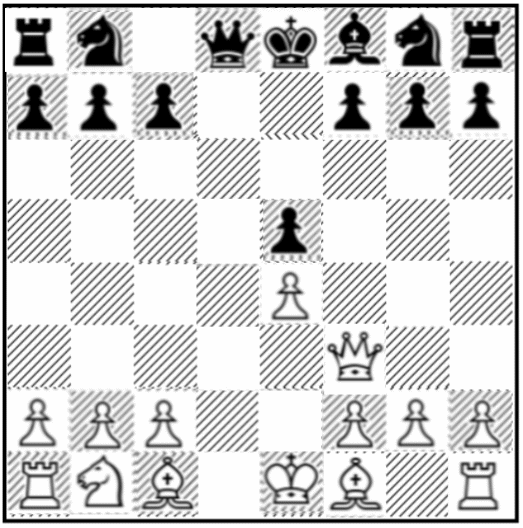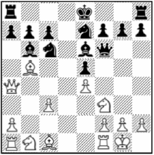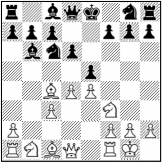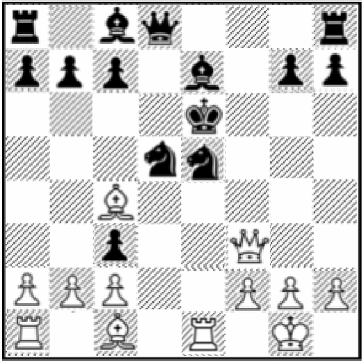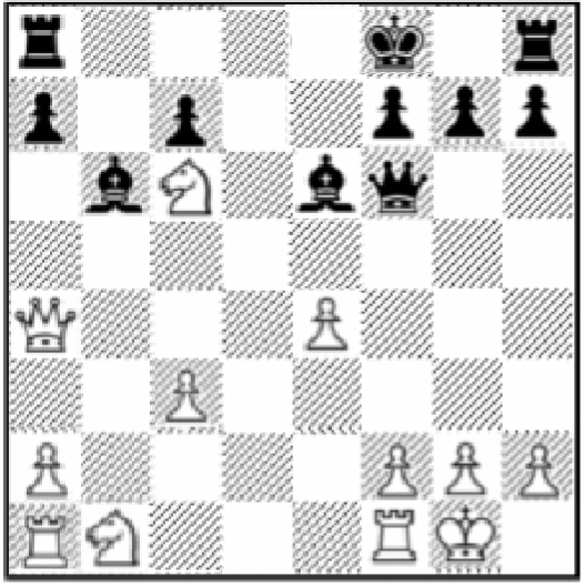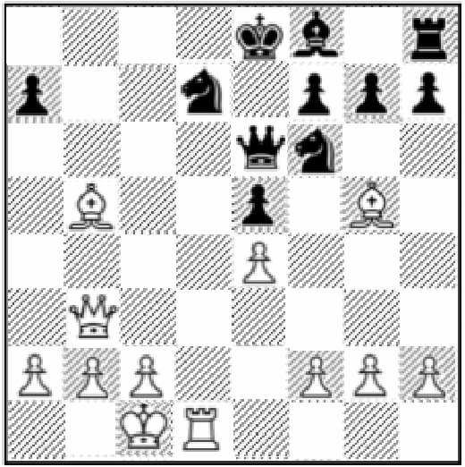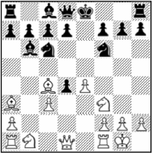 Рис. 3 Чёрные отстают в развитии своих фигур: ферзь на е7 блокирует королевский фланг чёрных, не развит их ферзевый фланг. Поэтому ход чёрных 9. . . b7 – b5 грубая стратегическая ошибка. Он ухудшает позицию чёрных, а именно безопасность их короля. Для продолжения атаки белые жертвуют коня за две пешки с целью разрушения пешечного прикрытия чёрного короля по диагонали а4 — е8: 10.Kc3 : b5 и 11.Cc4 : b5.