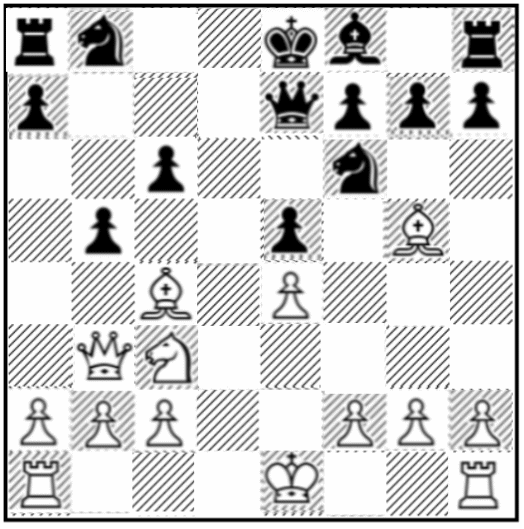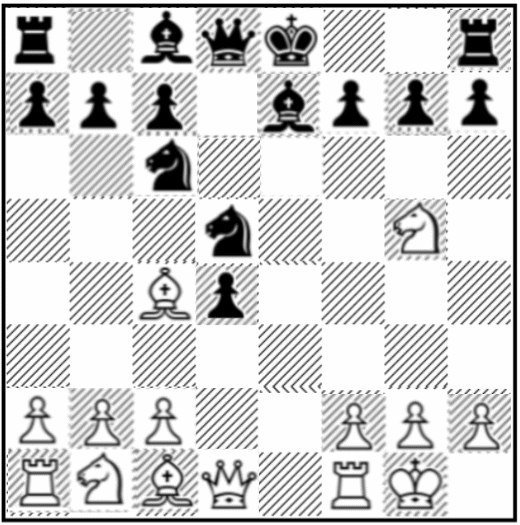 Рис. 10 Позиция белых фигур активнее. Их конь атакует поле f7,открыты вертикаль «е» для ладьи и ферзя и диагонали для слонов. Чёрные подготовили короткую рокировку и если они её сделают, то их король будет в относительной безопасности. Следовательно белым необходимо атаковать, а для этого не дать чёрным рокироваться.