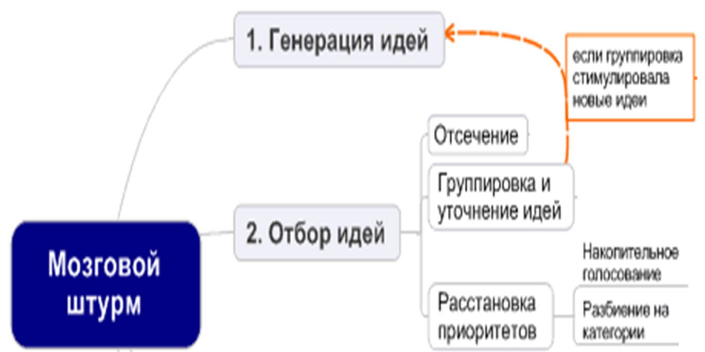 После того, как все варианты озвучены, выбираются те, которые более всего подходят для успешной реализации на практике. Обычно мозговой штурм состоит из трёх обязательных этапов, различных по организации и правилам проведения