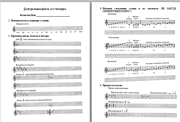 Тестовые задания помогают более индивидуально проверять знания учеников, анализировать, что бы в последствии устранить пробелы в знаниях, за счет работы над ошибками. Пример тестов по сольфеджио и музыкальной литературе, вы можете увидеть в Приложении 5.